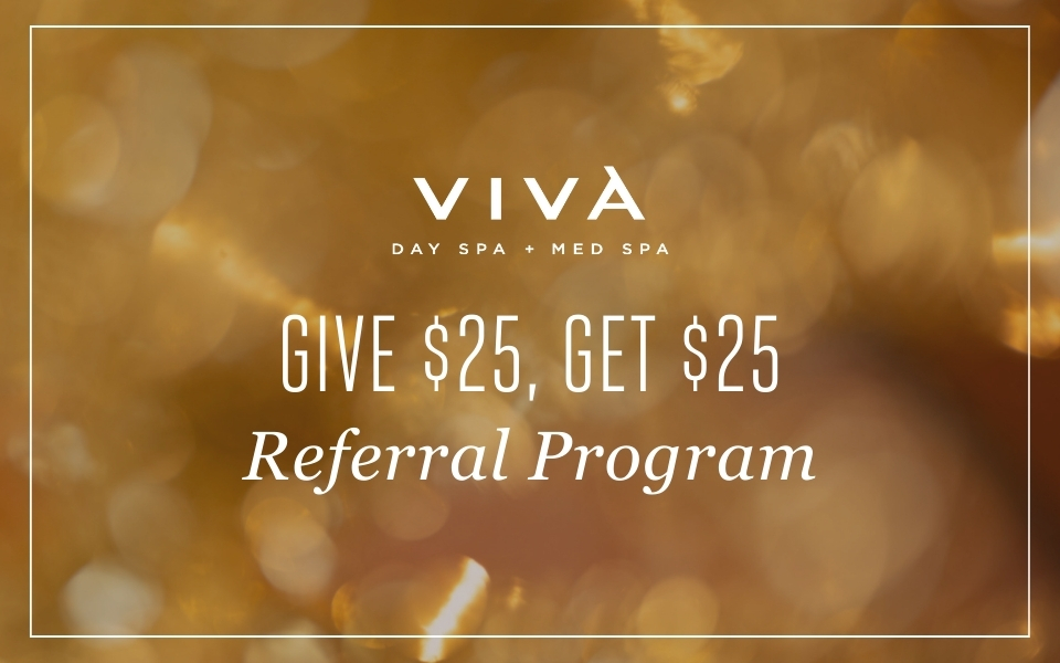 Valid for new client referrals only. $25 will be applied to new, referred guests as a discount to their first transaction and is valid for any service but is not applicable to products or gift certificates. There is no cash value. Discount may be used any time, any day with no expiration but is non-transferable. Only one referral credit may be used per visit and cannot be used toward gratuity. Referral discount is not combinable with other discounts. Viva reserves the right to change referral program rewards at any time.